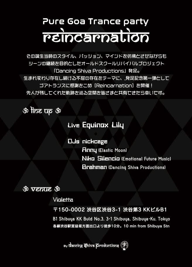 生まれ変わり存在し続ける不屈の存在をテーマに、発足記念第一弾としてゴアトランスに感謝をこめ[REINCARNATION]を開催!